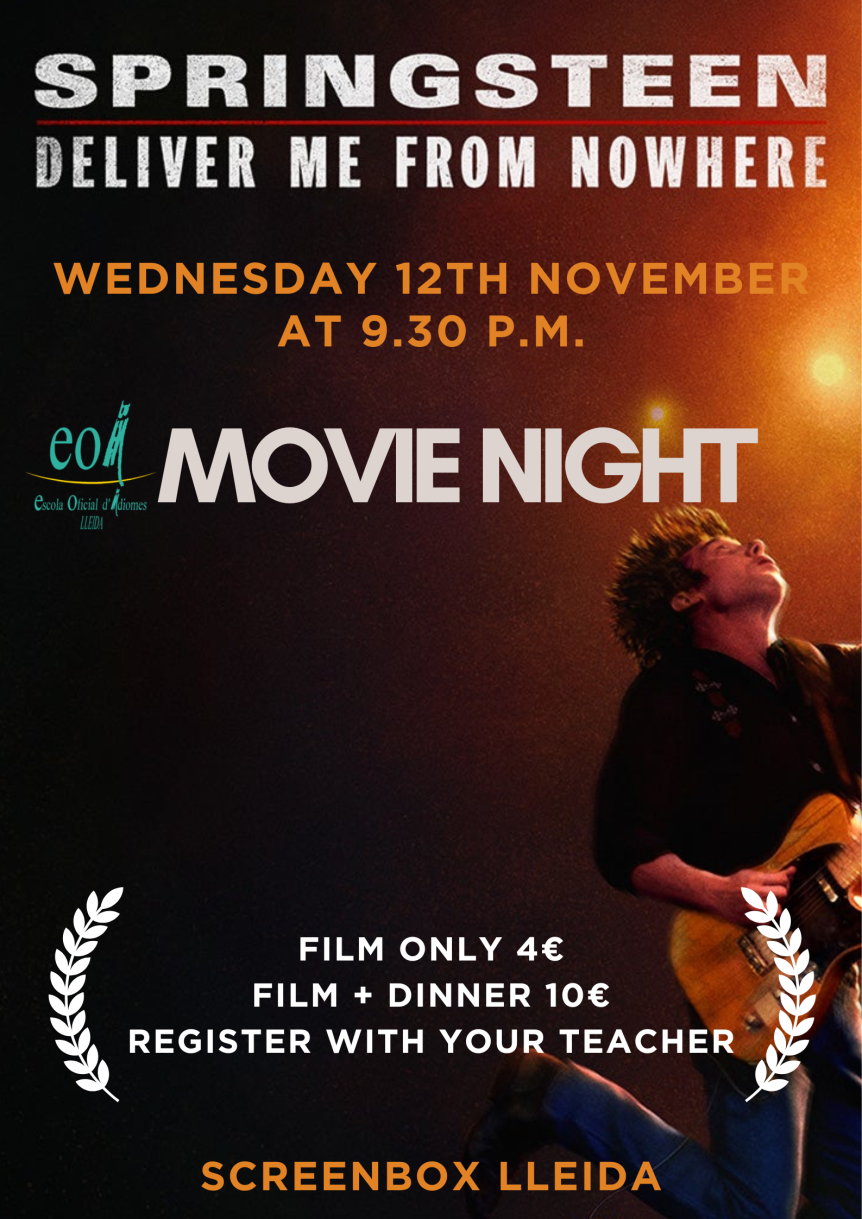 Come and join us on Wednesday 12th November for a movie night at Screenbox Lleida! We’re going to watch “Springsteen, deliver me from nowhere”. Don’t forget to sign up via your teacher!