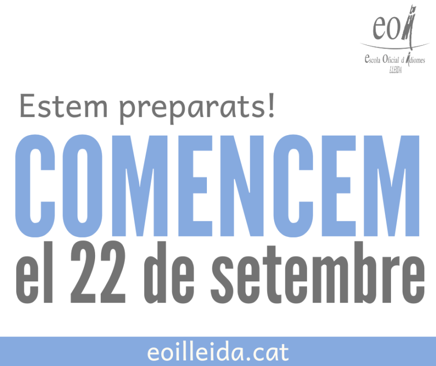 Des de l’EOI us donem la benvinguda a l’escola. Les classes començaran dilluns, 22 setembre, pels grups de dilluns i dimecres i grups dels cursos intensius i dimarts, 23 de setembre pels grups que tenen classe els dimarts i dijous. Bon inici de curs!