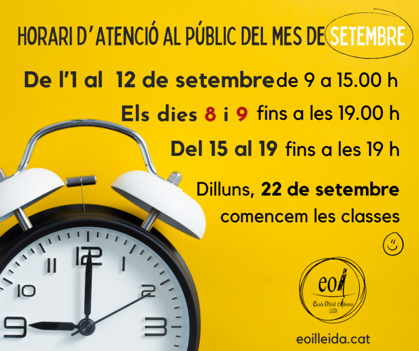 ’horari d’atenció al públic aquest mes de setembre fins a l’inici de les classes serà el següent:Les dues primeres setmanes de setembre pots venir a l’escola de 9 a 15 h.Els dies 8 i 9 de setembre de 9 a 19 hDel 15 al 19 de setembre de 9 a 19 hRecorda que el dia 22 comencem les classes i l’escola ja …