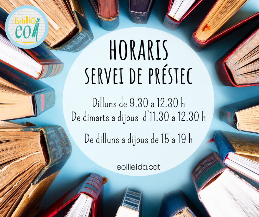 Des de la biblioteca us volem donar la benvinguda a l’escola i desitjar-vos un bon inici de curs 2025-26. El servei de préstec a partir de l’1 d’octubre serà amb els següent horari: MATINS Dilluns de 9.30 a 12.30 h De dimarts a dijous d’11.30 a 12.30 h TARDES De dilluns a dijous, de 15 a 19 h