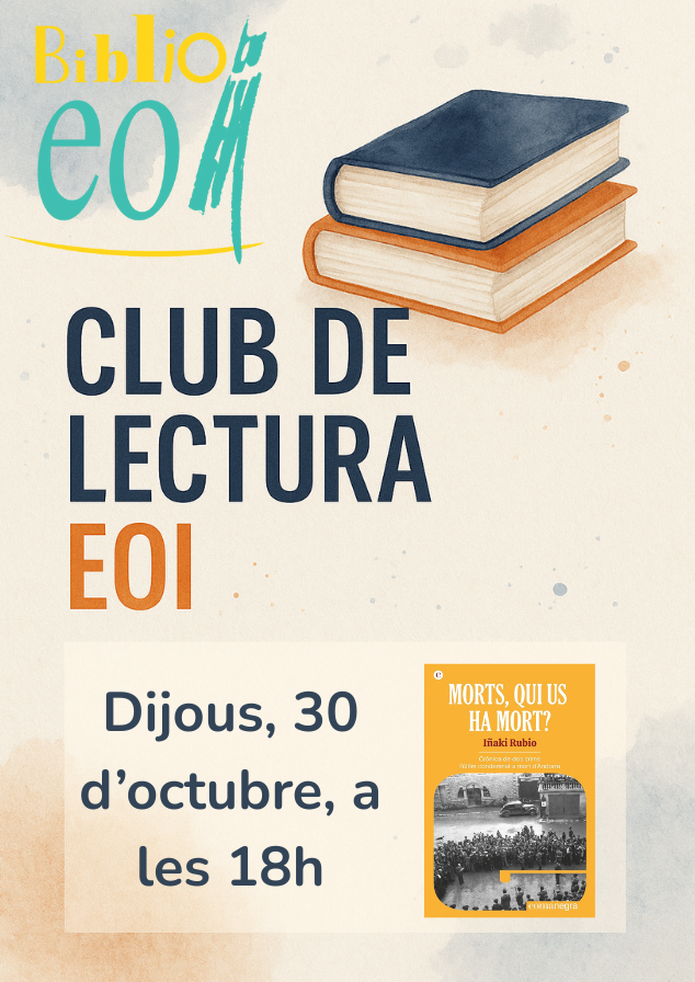 Comencem el Club de Lectura de l’EOI! El primer llibre que llegirem és Morts, qui us ha mort? d’Iñaki Rubio.Una novel·la intensa i plena de veus que explora la memòria, les històries familiars i els secrets que es revelen després de la mort. Ens trobarem el dijous, 30 d’octubre a les 18 h per compartir impressions i gaudir plegats de …