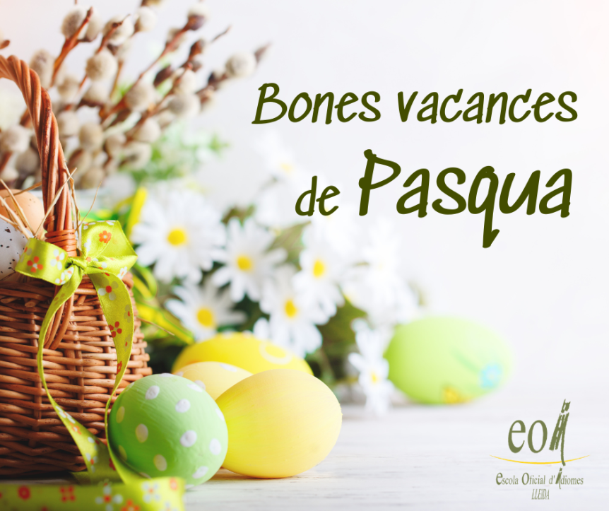 Us desitgem a tots bones vacances! L’EOI de Lleida estarà tancada fins al 6 d’abril inclòs. Us esperem el dia 7 d’abril preparats per tirar endavant amb la recta final de curs!
