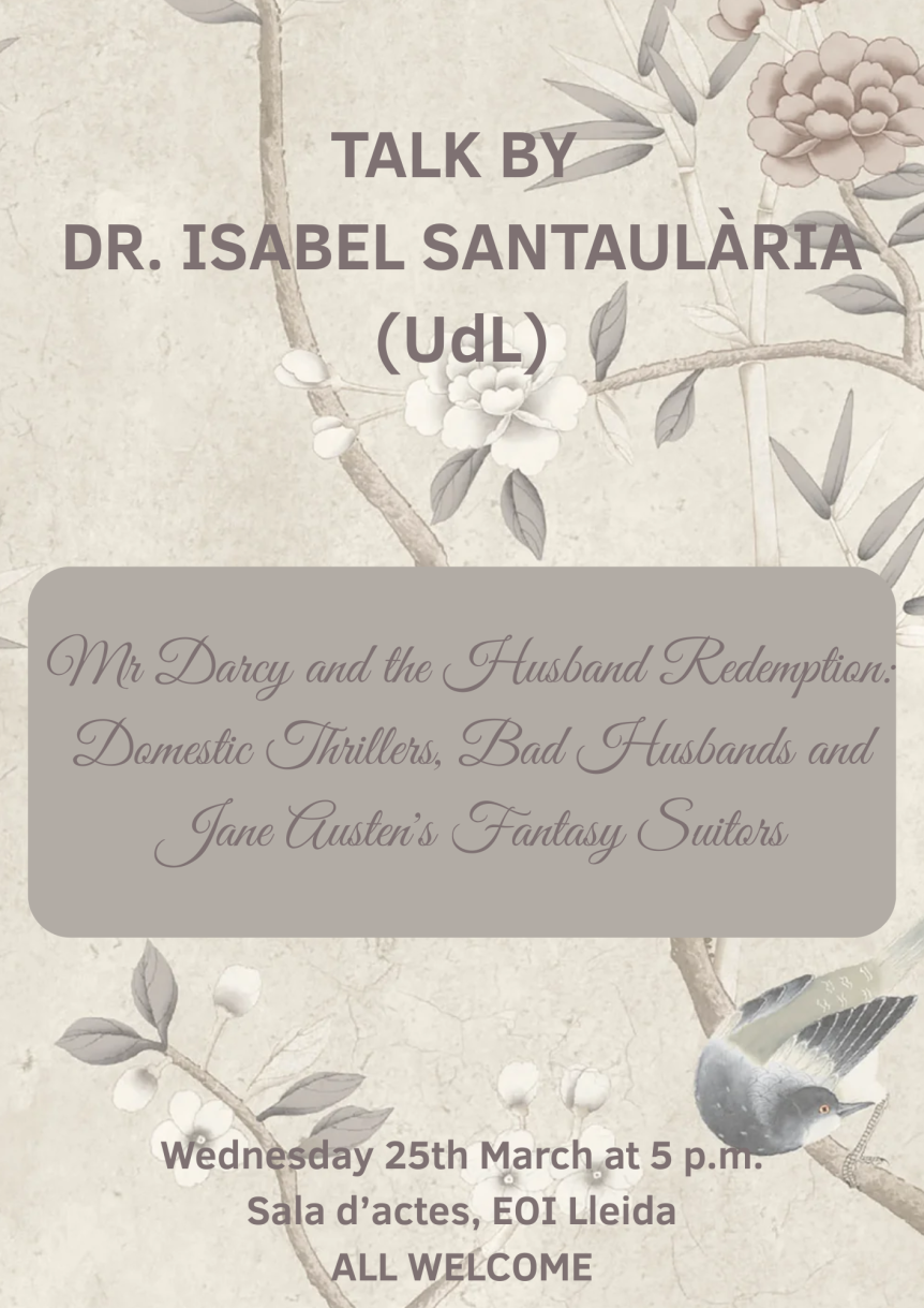 This Wednesday, 25th of March at 5 p.m. we’ll have the pleasure of listening to Dr. Isabel Santaulària from the UDL. Her talk, “Mr.Darcy and the husband redemption: domestic thrillers, bad husbands and Jane Austen’s fantasty suitors” connects Jane Austen and International Women’s Month. All welcome!
