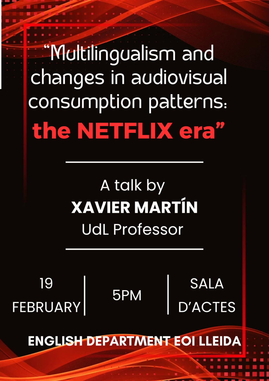 The English Department has organised a talk by UDL Professor Xavier Martín this Thursday 19th February at 5pm. It is called “Multilingualism and changes in audiovisual consumption patterns: the Netflix era”, and it connects with our school’s cross-curricular project “The world through cinema”. Feel free to come along!