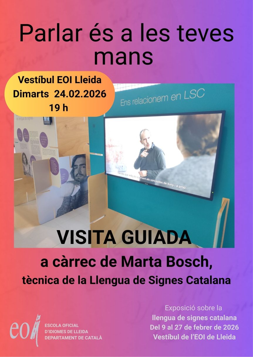 Heu experimentat ja amb exposició “Parlar és a les teves mans” sobre la llengua de signes catalana? El dimarts 24 de febrer a les 7 de la tarda, al vestíbul de l’EOI de Lleida, podrem endinsar-nos més en la comunicació visogestual amb la visita guiada en LSC a càrrec de Marta Bosch Baliarda, tècnica de la Llengua de Signes Catalana …