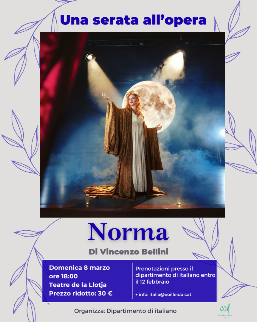 Il Dipartimento di Italiano vi invita a partecipare a una serata a La Llotja per godere dell’opera Norma, di Vincenzo Bellini, uno dei capolavori assoluti del melodramma italiano. Data: domenica 8 marzoOrario: 18:00Prezzo speciale: 30 euroPrenotazioni: presso il Dipartimento entro il 12 febbraio. I posti sono limitati. Un’occasione unica per vivere dal vivo la grande musica e condividere un’esperienza culturale …