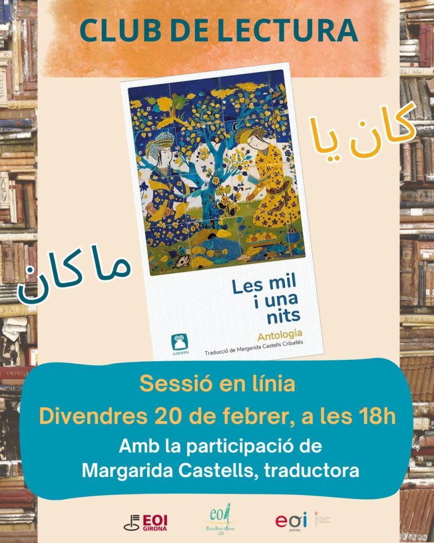 Us recordem que la propera sessió, conduïda per l’EOI de Girona i dedicada al llibre Les mil i una nits (una antologia), tindrà lloc el dia 20 de febrer i comptarà amb la presència de la traductora i arabista Margarida Castells. Aquí teniu l’enllaç del formulari d’inscripció: https://docs.google.com/forms/d/e/1FAIpQLSduvR8YVuNMvrc_pRSQH0WPk9auDFH57mLrQDvCyfbn3Rk51w/viewform?usp=header Us animem a participar-hi! !نشجعكم على المشاركة فيها