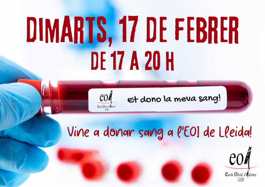 Dimarts, 17 de febrer, de 17 a 20 h, l’escola se solidaritza amb el Banc de Sang i Teixits per donar sang. De 17 a 20 h a la sala d’actes hi haurà una unitat mòbil del Banc de Sang rebent a tothom qui vulgui col·laborar. Gràcies per la teva col·laboració!