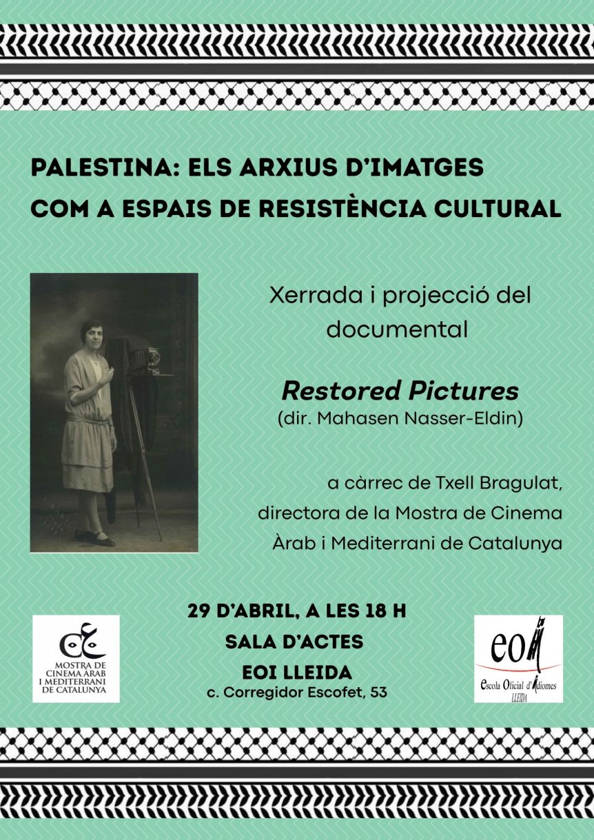 Xerrada a càrrec de Txell Bragulat, directora de la Mostra de Cinema Àrab i Mediterrani de Catalunya, i projecció del documental Restored Pictures, dirigit per la cineasta palestina Mahasen Nasser-Eldin. El documental explora la vida de Karimeh Abboud, la primera fotògrafa a la Palestina d’abans de la Nakba (1948).